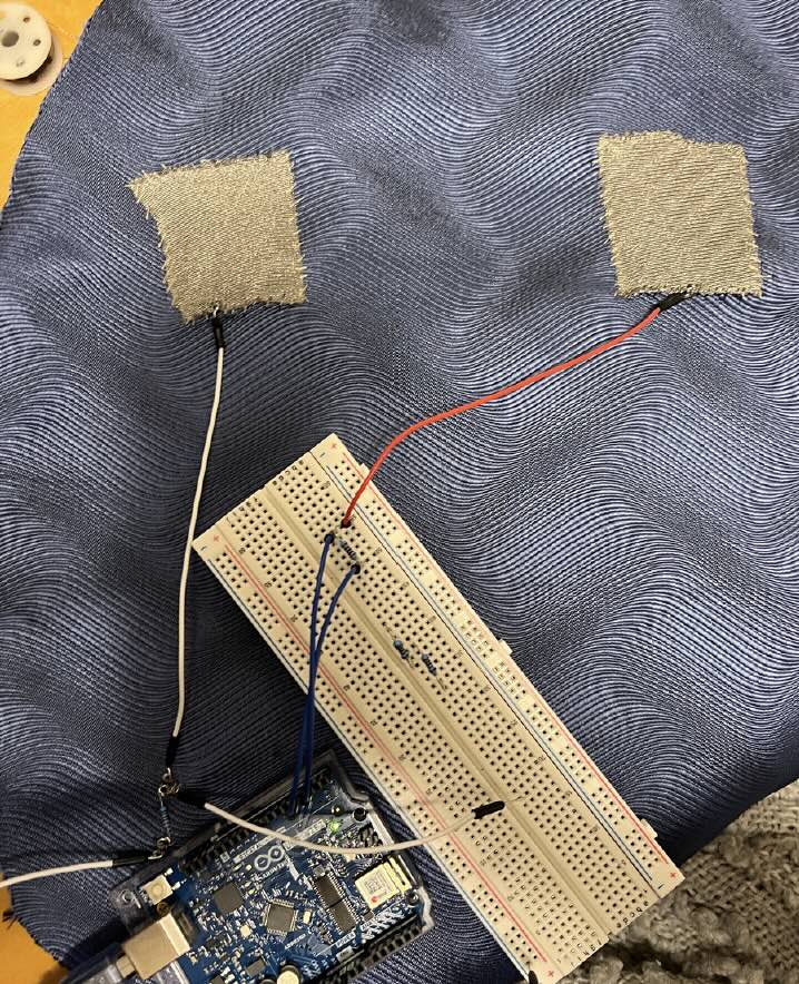 Power management became a significant hurdle, as I discovered that my conductive fabric sensor required a ground connection, which prevented me from utilizing the battery power I had initially intended. The conductive fabric was also less reliable than my initial aluminum foil proof-of-concept, requiring calibration of trigger sensitivity levels to achieve optimal performance.